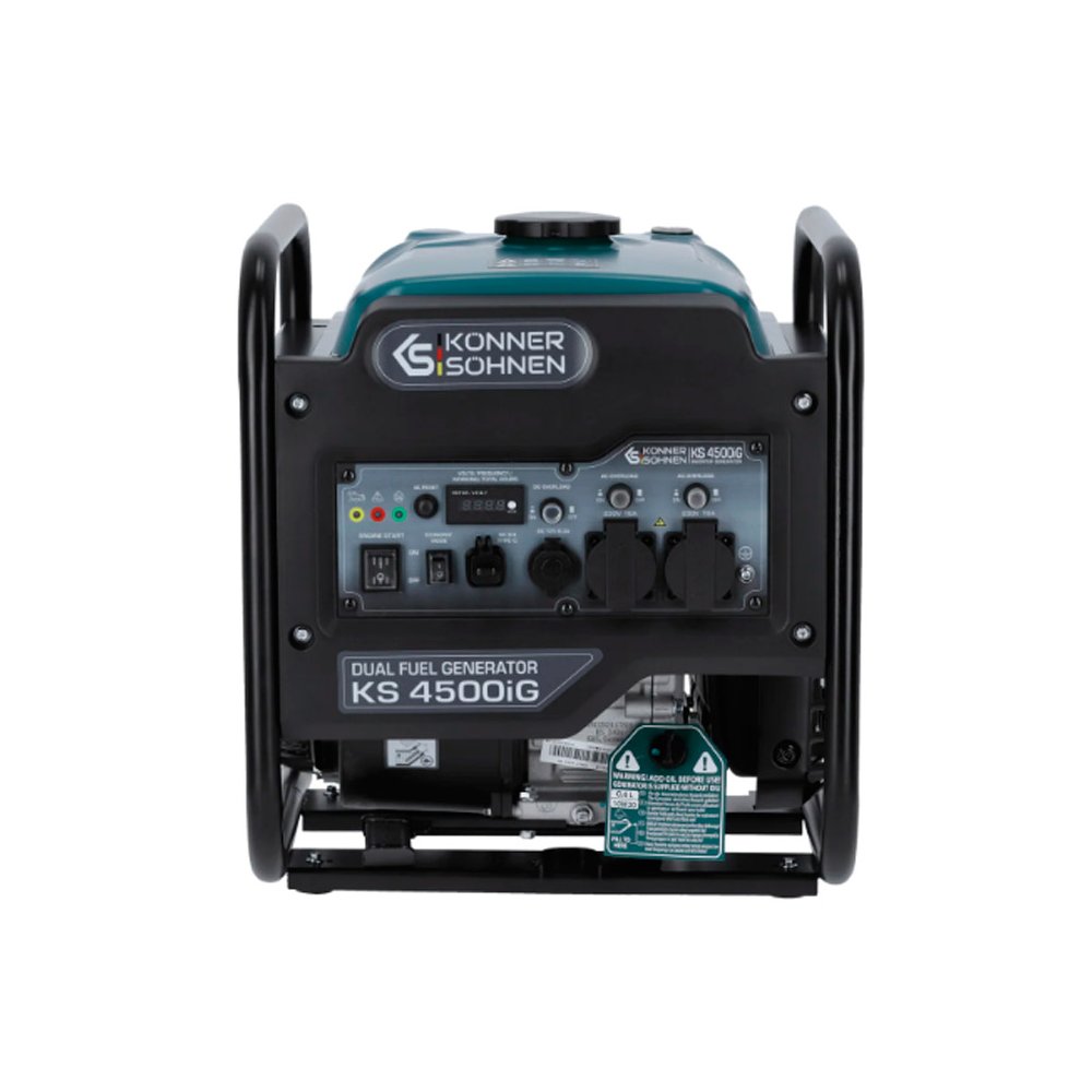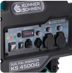 Модель гібридного генератора Konner&Sohnen KS 4500iG забезпечена двигуном з номінальною потужністю 4,2 кВт, який працює на двох видах палива: бензині і газі (пропан-бутан).