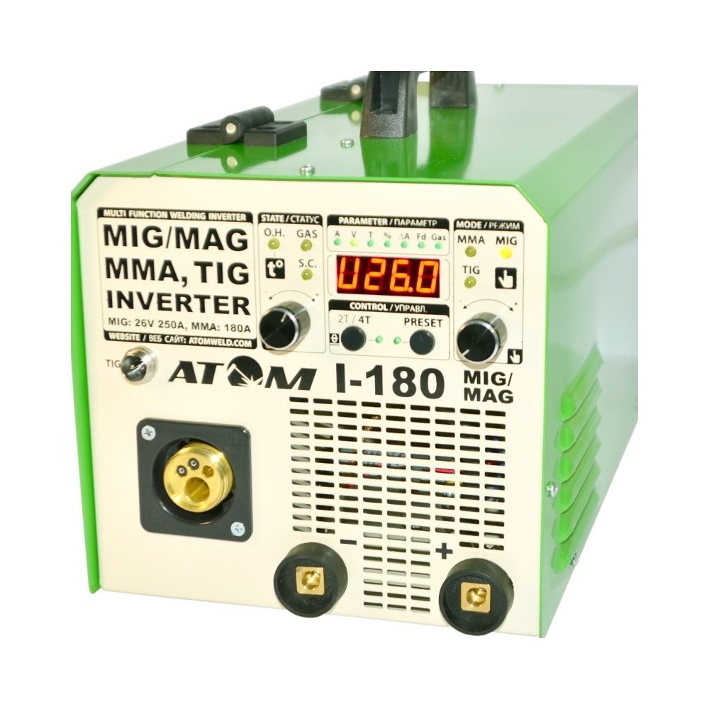 Сварочный полуавтомат Атом I-180 MIG/MAG предназначен для следующих видов сварки в среде защитных газов и смесей на постоянном токе: ручная дуговая (ММА), полуавтоматическая (MIG/MAG). Относится к классу профессиональных приборов.