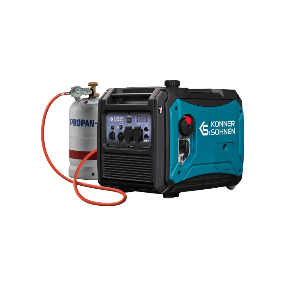 Модель гибридного генератора Konner&Sohnen KS 4000iEG S снабжена двигателем с номинальной мощностью 3,5 кВт, который работает на двух видах топлива: бензине и газе (пропан-бутан).